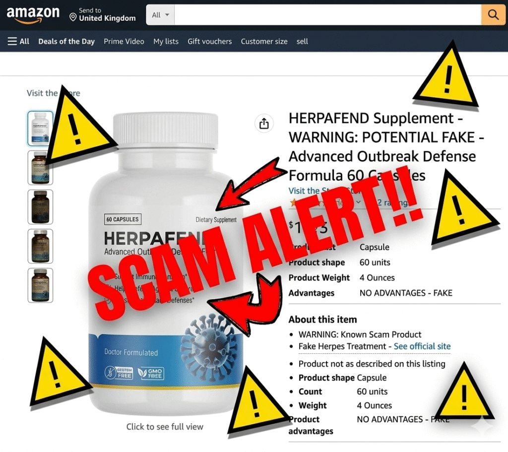 Our team uncovered numerous alarming complaints from individuals who ordered what they believed to be Herpafend through third-party websites like Amazon, eBay, or even Walmart. These customers reported receiving counterfeit bottles with altered or completely different ingredients — products that were not only ineffective but also carried potential health risks.